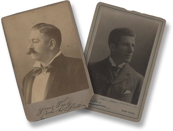 Includes Newsboy Cabinet Card of James J Corbett and Cabinet Card of John L Sulivan with facsimile signature (chip in lower right corner). Cobett is VG-EX, Sullivan VG.