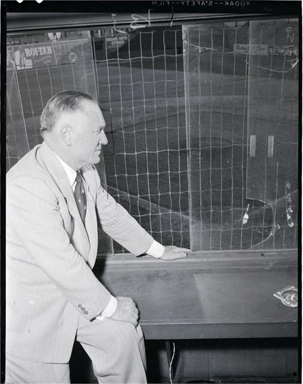 The Oakland Oaks of the Pacific Coast League played their last game at Oaks Stadium in 1955. This lot of negatives (7) includes shots from their last game that year. It even includes a photo of Arthur Driefer, Stadium Superintendent, turning the key to lock up the place up after the final game with the Seals. There are also shots of Brick Laws, owner, paying his final respects to the Stadium. Interestingly the site is the current home of Pixar Animation Studios.