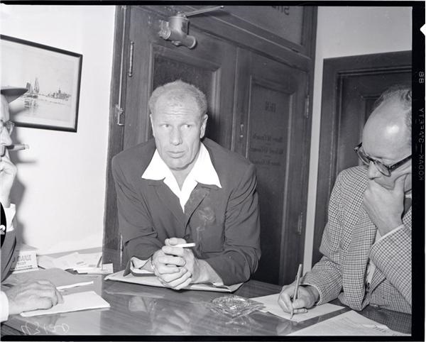 Collection of negatives (6) of baseball franchise owner and promoter Bill Veeck. Known as "Sport Shirt Bill" he was the king of publicity stunts. These shots were taken in August of 1953.