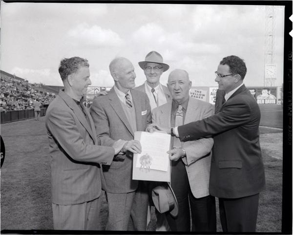 Selection of Pacific Coast League old timers player negatives (7). They include Earl Averill, Sam Crawford, Bill Steen, Ping Bodie, Dom DiMaggio, Steve Bilko, Clay Bryant and others. Shot in 1957 at San Francisco's Seals Stadium.