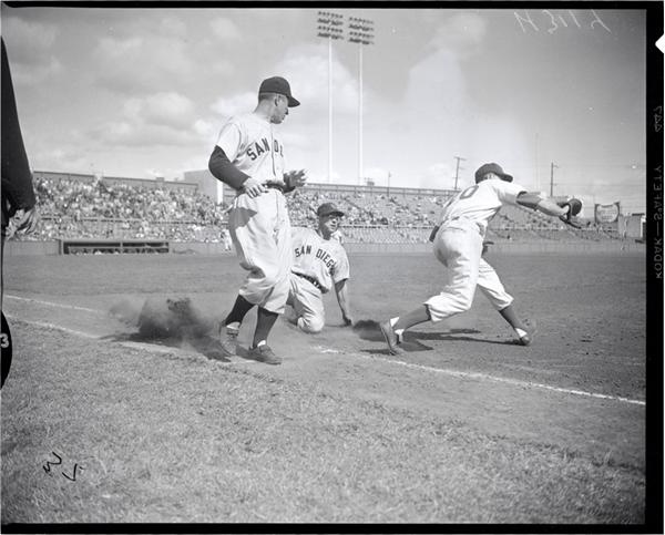 Massive compilation (175+) of Pacific Coast League baseball negatives from the SF Examiner archives. Includes images of the Oakland Oaks, SF Seals, LA Angels, Seattle Rainiers, San Diego Padres, Sacramento Solons, Portland Beavers and the Hollywood Stars. Players represented include Lefty O'Doul, Red Mathis, Buddy Peterson, Jim Moran, Gene Baker, Sam Chapman, Red Adams, George Metkovich and Pants Rowland.