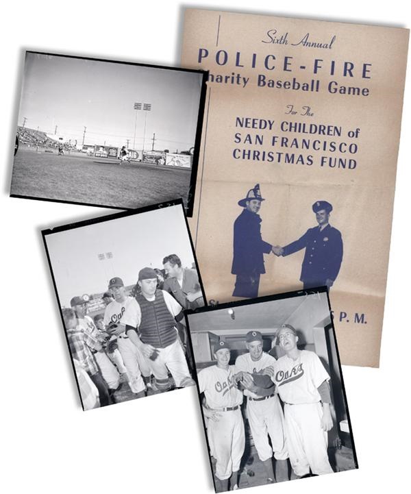 Negatives of PCL action including the Oakland Oaks vs. Portland Beavers. Players pictured are Bob Murphy, shown pitching, and being mobbed by autograph seekers. Jim Marshall and George Kelley are also featured. Images captured in 1953. There is also a Police-Fire Charity Game Program for the event that took place in San Francisco at Seals Stadium June 21.