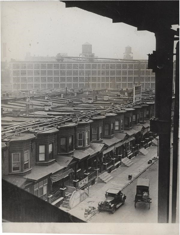 This 7 x 9" photograph captures houses near Philadelphia's Shibe Park placing bleechers and stands atop roof tops in hopes of catching a glimpse of the Series games against the Chicago Cubs. The image has some minor discoloration but is in VG condition.