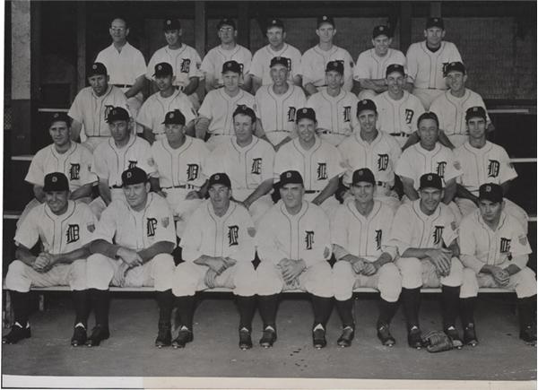 This 6.5 x 9" team photograph of the 1945 Chapionship Season Detroit Tigers is in NRMT condition with excellent color quality and very minor wrinkles on the bottom border.  Attached to the verso is the International News clipping listing all of the players, coaches and managers in the photograph.