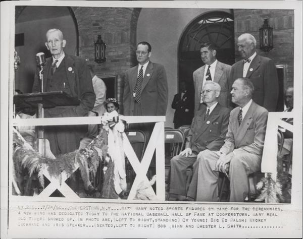 This VG quality 7 x 9" wire photo was taken during ceremonies dedicating a new wing to Cooperstown's Baseball Hall of Fame. There are many notable oldtimers attending the dedication and are captured in this photograph, the most notable being Cy Young, but also Big Ed Walsh and Mickey Cochrane. The photo has great color quality and very slight creasing along the bottom portion of the image.