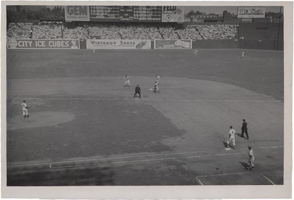 This is a very exciting collection of 4 5 x 7" images that captures a run by Jackie Robinson from 1st to 2nd base during a 1949 game between the Dodgers and the Cardinals. The photographs are in very good condition with some slight discoloration and minor wrinkling, primarily around the edges of the photographs. It is a unique series of action photographs which not only chronicles the run of one of baseball's most legendary players, but take a good look and you'll see Stan "the Man" Musial holding down the fort on first base!