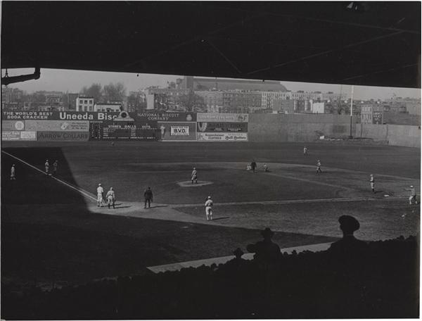 Simply amazing shot of game action at Ebbets Field 9/21/20. The caption sheet on the back is titled "Where World Series Games Will Be Played." Extremely clear image with great outfield advertising for Nabisco and Boston Garter. 7.25 x 9.25''. EX-MT.