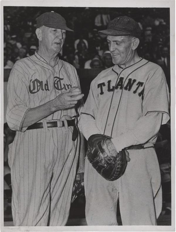 Pitching legend Cy Young is seen here with his former battery mate catcher Bob Higgins. 7" x 9" wire photo shot in 1937 is in VG-EX condition with original newspaper clipping taped to the verso.