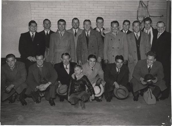 Team photo taken at the train station just after they won the NFL Championship. Each player is identified on the back. 6.5 x 9''. EX-MT.