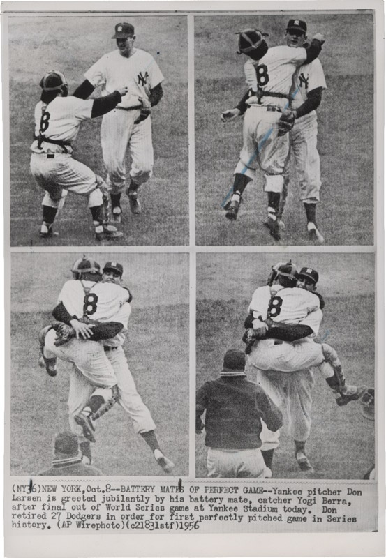 Berra makes a leap into Larsen's arms after Larsen pitched his perfect game. 7 x 9''. EX-MT.