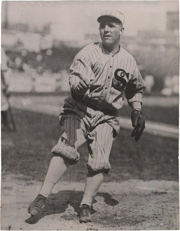 Amazing image of this famous pitcher two years before he would help throw a World Series game. Dated Sept 22, 1917. Caption sheet attached to the back. 7.25 x 9.25''. EX/EX+.
