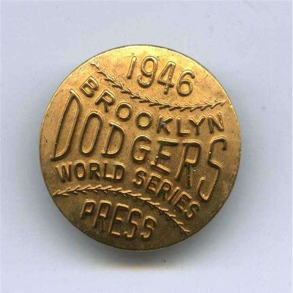 The Dodgers jumped the gun by a year issuing press pins for the 1946 World Series, which became "phantom" pins when they finished 2 games behind the pennant-winning Cardinals. Such phantom pieces are always great collectibles, and this 3/4" in diameter Dieges & Clust pin is one lovely mistake, engraved "1946 Brooklyn Dodgers World Series Press" across the shiny gold, slightly curved face shaped and detailed like a baseball. Mint.