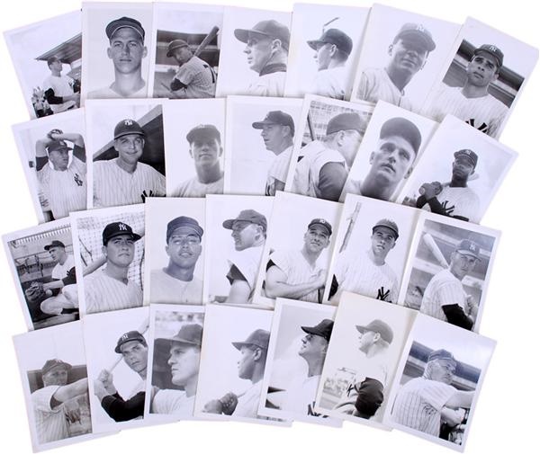 Interesting lot of twenty-eight snapshot photographs picturing members of the New York Yankees. All are close up shots taken from the field (no far away grandstand sunday shooter shots). Pictured are Mickey Mantle, Roger Maris, Mel Stottlemyre, Crosetti, Clete Boyer, Tony Kubek, Ralph Houk, Bill Skowron, Elston Howard, Whitey Ford, and more. About 2.5 x 3.5''. EX-MT.