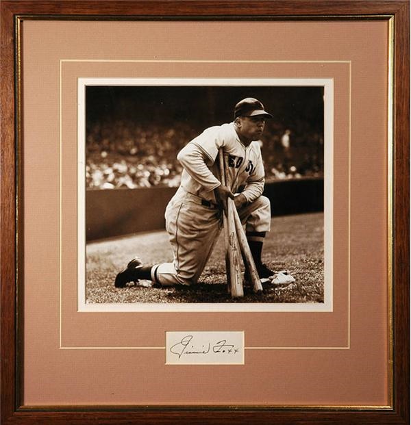 14.5 x 15'' framed and matted display with mint black ink signature of Jimmie Foxx mounted with a great modern print of Foxx with the Red Sox.