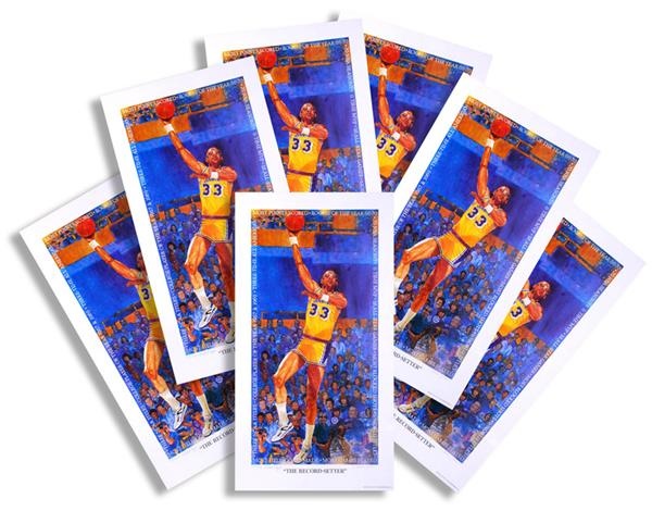 Great lot of (7) signed limited edition (of 1989) lithographs celebrating the legendary basketball career of Kareem Abdul-Jabbar. The Lakers #33 is shown in the midst of his classic lay-up with a host of famous Lakers fans cheering from the stands. Each litho is hand numbered and signed by the artist, Michael Taylor and Abdul-Jabbar. Each MT poster measures 19 x 34".