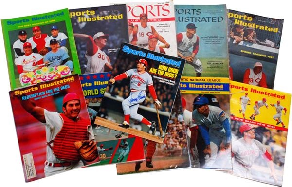 Comprehensive collection of thirty-two complete issues of Sports Illustrated with Cincinnati Reds covers. Better issues include 1956 w/ Klu, 1957 w/ McMullan, 1968 w/ Bench, 1968 w/ Rose, 1969 w/ Rose, 1970 w/ Bench, 1972 w/ Bench, 1974 w/ Rose, 1976 w/ Morgan (autographed), 1976 w/ Bench, 1978 w/ Rose and more. EX-MT to Mint. There are also fifteen issues of Sport Magazine. Better issues include 1954 w/ Klu, 1965 w/ Frank Robinson, 1967 w/ Rose, 1968 w/ Rose, 1970 w/ Bench and more. VG-EX to Near Mint.