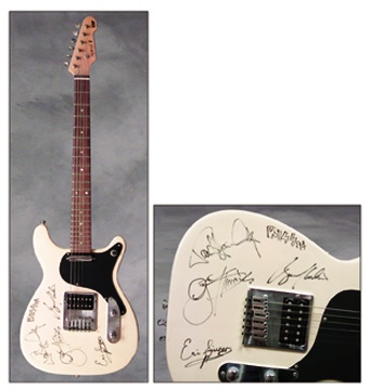 ESP Hybrid II Model electric guitar has been signed by Paul Stanley, Gene Simmon, Eric Singer and Bruce Kuhlick with Kiss '94 doodle.