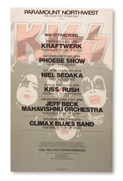 Really magnificent 1975 cardboard concert poster features a background Kiss image and a stellar lineup of acts at the Paramount Northwest Theater in Seattle, Washington including Kiss and Rush (May 24th), Jeff Beck and the Mahavishnu Orchestra (June 4th), Phoebe Snow, Neil Sedaka, Climax Blues Band, and Kraftwerk. Couple of tack holes, otherwise EX.