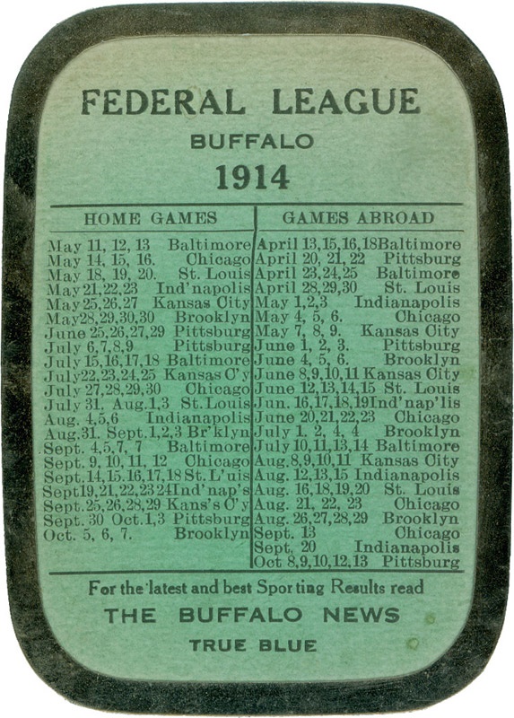 2.5 x 3.5'' pocket schedule issued by the Buffalo News. The Federal League schedule is printed on one side, International League schedule on the other. Metal border with heavy paper insert. EX-NM.