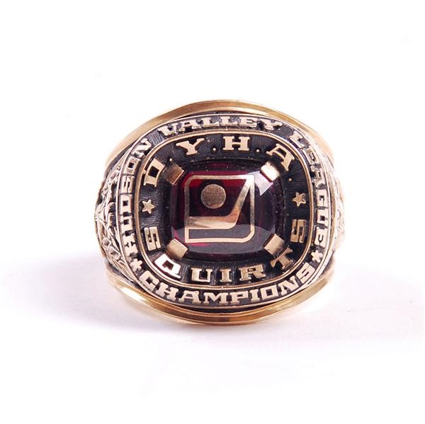 Fine, 10K Jostens championship ring created for Hudson Valley League Hockey. One side of the ring is carved with a hockey player and the name J. Barysh. The opposite side is carved with an Olympic torch and rings. A red stone is bezel set on the top and inlaid with a gold hockey stick and puck symbol. Inside inscription is "1991 James Barysh". Size