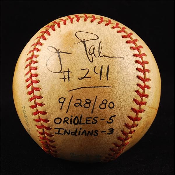 Official American League MacPhail Baseball obtained right after the game and signed at that time by Palmer. The inscription was added "9/28/80 Orioles -5 Indians -3." Ball shows moderate to heavy use, signature is mint.