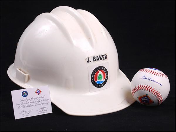 Interesting lot of two pieces related to the opening of Boston's famed Ted Williams Tunnel in 1995. Includes souvenir stamped Baseball given only to those that contributed to the completion of the tunnel by the MA Highway Administration with facsimile Ted Williams signature and several official emblems. Also included in this lot is a used workers hardhat with "Central Artery Tunnel" decal on the front (shows moderate use).