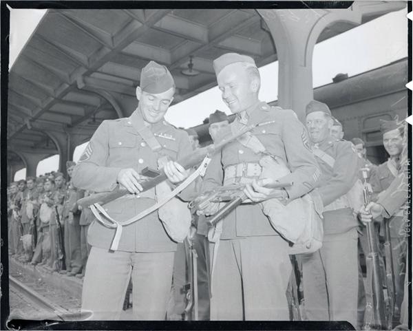 Interesting lot of over 75 original 4 x 5'' negatives related to WWII. Includes Dwight D Eisenhower arriving in the city, Tanks, Airplanes, Soldiers, Survivors from Sinking Ships, Prisoners, Famous Battlers, and more. About 70% are vintage copy negs, but of great battle images. All are housed in the original envelopes with the subjects identified on the front. EX-MT