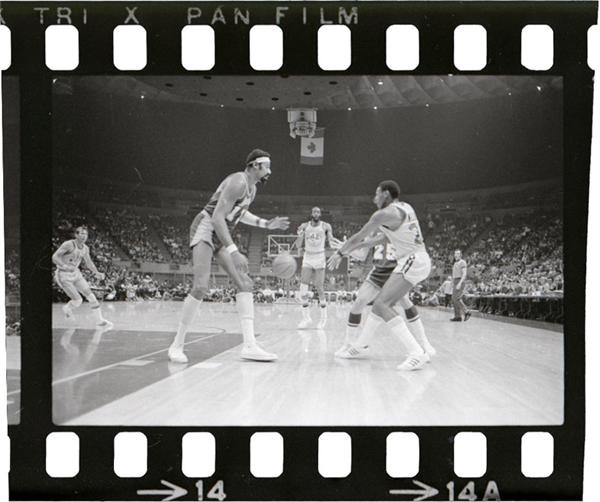 Lot of over 150 original black and white 35mm negatives of Basketball game action. Games include Dec 9, 1971 Warriors vs Lakers. Dec 4, 1971 Warriors vs Suns. Jan 4, 1972 Warriors vs Braves and Jan 11, 1971 Warriors vs Cleveland. All of the stars are pictured. All are housed in the original envelopes with the subjects identified on the front. EX-MT