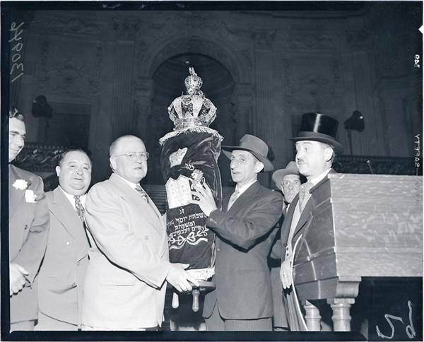 One lot of (34) original 4 x 5'' negatives keyed to the Jewish community in San Francisco. Includes Benjamin Epstein organizer of the Anti Defamation League, James McDonald Ambassador to Israel, Purim Ball Queen, Israel Bonds Drive, Dr Dov Joseph Israel Minister, Jewish Welfare, Jewish Aged Party, Beth Israel Temple Dedication, Torah Scroll Presentation, Ambassador Abba Eban and more. All are housed in the original envelopes with subjects identified on the front. EX-MT.