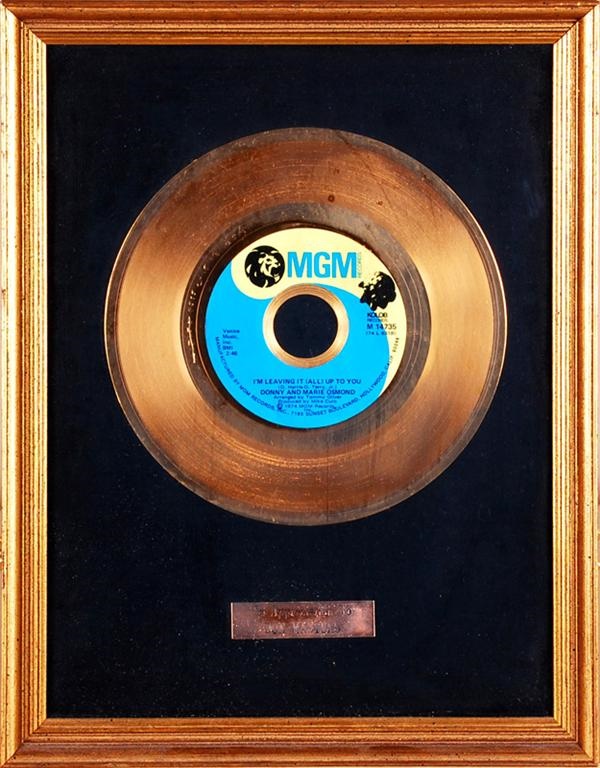 The uber-wholesome sibling duo, Donny and Marie Osmond, got plenty of airplay in the 70's as evidenced by this gold record for their single "I'm Leaving it (all) up to You". This framed gold record display was presented in appreciation to Don Masters. Measures 10 x 13".