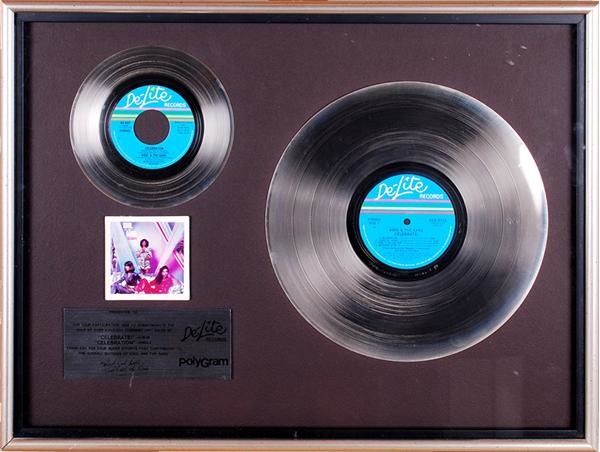 What may be most ubiquitous disco record of all time hit in 1980. The record "Celebration" and "Celebrate", the Kool and the Gang album from which it came, went platinum. This framed display features both the platinum record and album with a small replica of the "Celebrate" album cover. It was presented in 1980 to Don Masters. Measures 19 x 25".