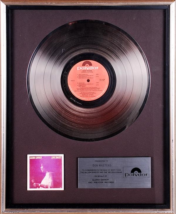 Still an anthem for karaoke lovers and bitter dump-ees the world over, Gloria Gaynor's massive hit single "I Will Survive" powered her 1978 album "Love Tracks" to platinum. It is displayed here with side 2 (including "I Will Survive") facing forward and a small replica of the "Love Tracks" album cover. The display was presented to Don Masters to commemorate the platinum achievement. Measures 17 x 21".