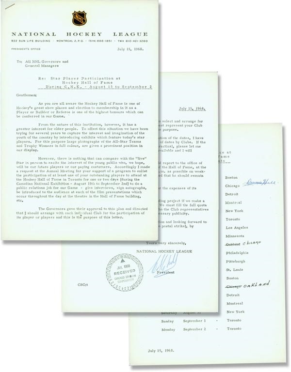TLS dated July 15, 1968 to the NHL Governors and GM's from Clarence Campbell, then president of the NHL, encouraging player participation in a Hockey Hall of Fame PR event in Toronto. It is typed on NHL President's Office letterhead and in NM/MT condition.