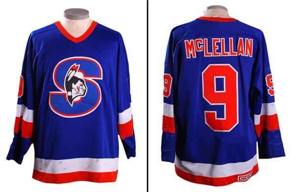 All original blue jersey has name sewn on a plate on the back and number 9 on back and both sleeves. CCM tag in the collar. Heavy use with loads of team repairs, stick marks, board burns, paint transfers and pilling inside.