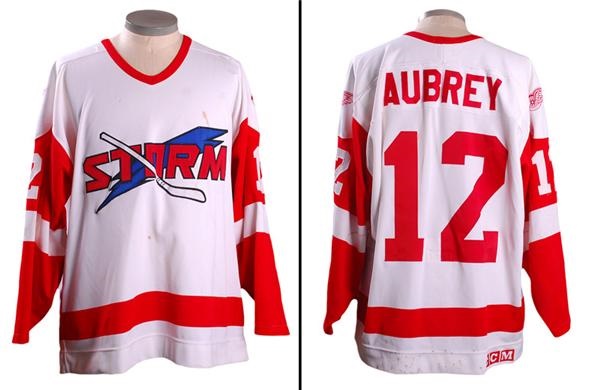 White jersey has name sewn on a plate on the back along with number 12 which also appears on both sleeves. Red Wings logos on both shoulders. Tagging has been removed from the collar due to a large repair that was made by the team. CCM on the hem on the back. Nice use with repairs, pilling, burns, rips, blood, and stick marks.