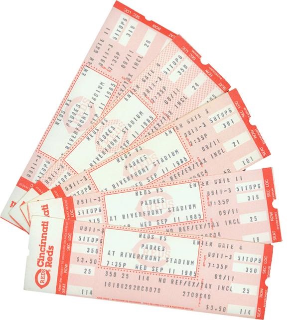 One lot of five full tickets to the Sept 11, 1985 game at Riverfront Stadium in which Rose made his historic hit #4192. NM-MT to Mint.