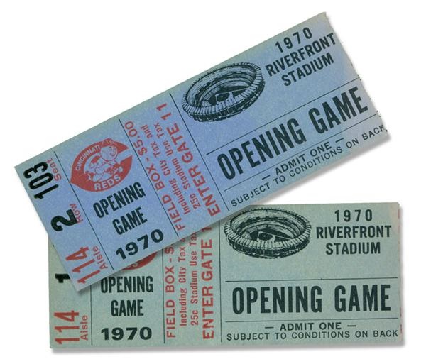 One lot of two stubs marked "Opening Game" and dated 1970. It was the first game at Riverfront Stadium. NM-MT.