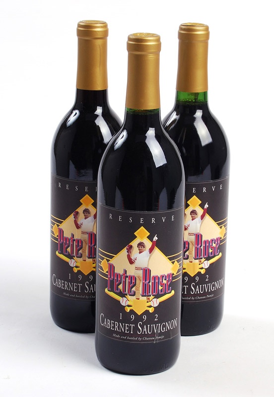 What better to commemorate one of the greatest members of baseball's "Big Red Machine" than a big red wine, a Cabernet Sauvignon, to be exact. This one was made by Chateau Pomije and is labeled "Pete Rose Reserve 1992". The label features a picture of Charlie Hustle himself and has a back label detailing his impressive career stats. I think Mr. Rose would approve. Lot includes (3) bottles.