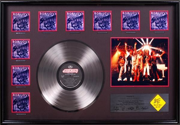 In 1987 Bon Jovi presented Don Masters with a multi-platinum record display for their most successful studio album, Slippery When Wet. The display features a platinum 33 1/3 RPM record, and 9 mini album covers commemorating every million records sold, and an 8x10 photo of the band on stage. Measures 21 x 31.5