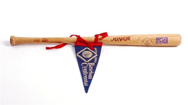 Baseball's centennial was celebrated in 1939. Here is a rare and well preserved artifact from that celebration. It is a "Junior" mini bat (20") affixed with a commemorative baseball 3 cent postage stamp and with a Cooperstown 1939 postmark. Tied to the handle is a mini pennant (8") in soft blue felt with red contrasting felt. The piece is in strong EX condition with two small spots of what appear to be price tag adhesive in the handle. Great baseball collectible.