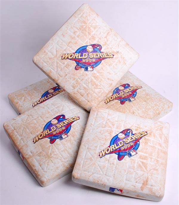 Lot of five bases used during the 2002 World Series, each with an MLB hologram affixed with individual serial number. Two are for Game 3, Three are for Game 4. Barry Bonds hit a Home Run in Game 3. All show use.