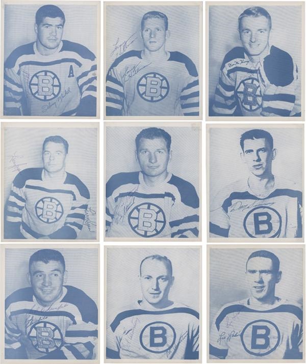1957 Boston Bruins picture pack of 18 photos with 17 of the photos signed. Signed pieces include Milt Schmidt, Fern Flaman, Vic Stasiuk, Johnny Peirson, Fleming Mackell, Allan Stanley, Bronco Horvath, Larry Hillman, Don McKenney, Don Simmons, Leo Labine, Bob Armstrong, Jerry Toppazzini, Larry Regan, Real Chevrefils, Doug Mohns and more. The unsigned photo is of Jack Caffery. Photos are EX or better. All signatures are in blue ballpoint.