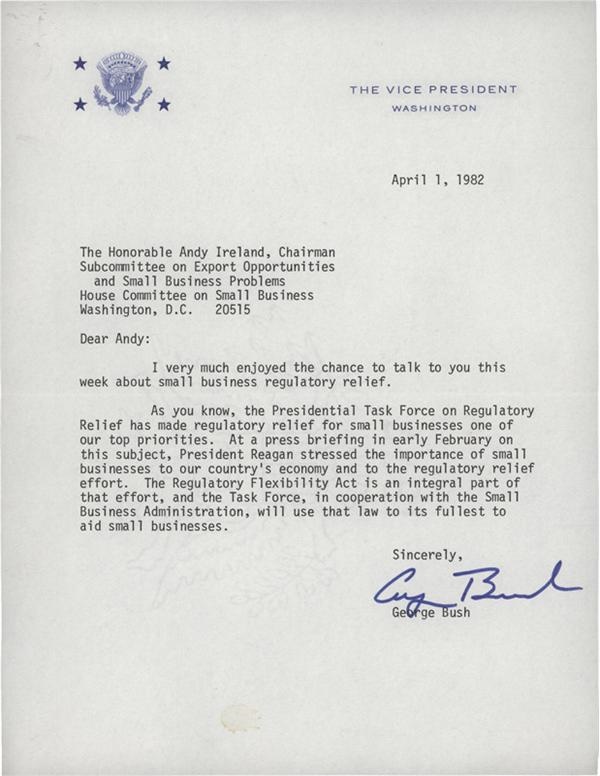 TLS from the future president, George H.W. Bush, on letterhead from the office of the Vice President. It is dated April 1, 1982 and addressed to a House Committee on Small Business Chairman, Andy Ireland. Small spot on the bottom of note, but otherwise perfect.