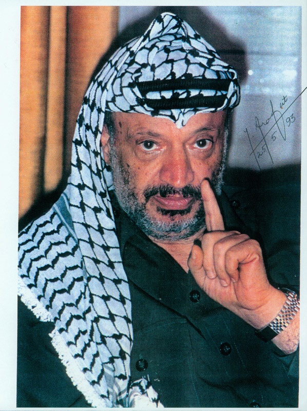 Divisive Palestinian leader Yassar Arafat is the subject of this photograph reproduced as an 8x10 color laser copy. He has signed the image with the date 25/ 5/ 93. Mint.