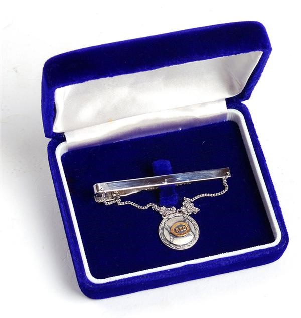 This tie bar was presented in commemoration of the Cincinnati Reds' tour of Japan in 1978. Beautiful silver bar has a baseball charm hanging from it on a chain. The baseball in inset with a gold Reds logo and the back has Japanese characters and the date: 1978. Mint.