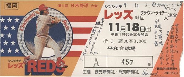 Official ticket to a Reds game in Japan picturing Pete Rose. There are several notations made in ink on the front, written in Japanese. Small crease near the tear. Rare!