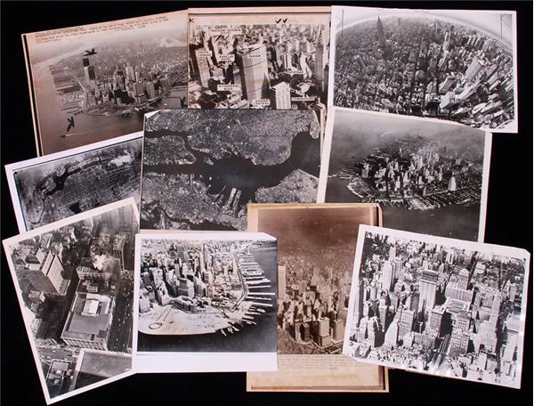 All are aerial views of New York City. Pictured are 34th and 35th street in 1941(scene of a deadly shooting), Skyline from 1960, Skyline from 1929, Skyline from 1930, Lower Manhattan in 1971, Manhattan in 1955, and more. Most are 8 x 10'' or slightly larger. VG-EX.