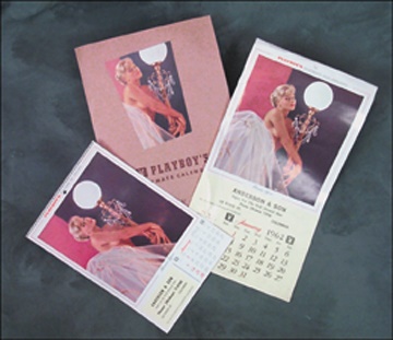 Never before seen by the Playboy expert we spoke to. Heavy cardboard 18x10" envelope with nude image and advertising for "Playboy's Playmate Calendars." Inside are two different 1962's in 17x9" and 12.5x8". Inside are Stella Stevens, June Wilkinson and more, more, more. One page is creased o/w NRMT.