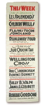 Fascinating oilcloth advertising poster stood in the front of a Midwest theater where the first gloved champion was making an upcoming appearance. Features "James J. Corbett" in "A Spirited Travesty." Full color letters are all hand painted making this a one of a kind. Overall very good. 23x75". This is a true period piece representative of a definitive era in American sports entertainment.