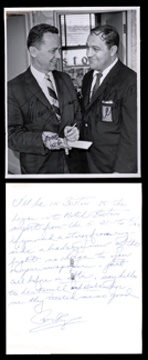 Unusual piece acts as both a signed photo and handwritten letter. 8x10" image of Rocky is signed in Mint black marker "To Maurg…Good Job…Rocky Marciano." Signature is Mint, but the contrast is not the greatest. The plain white verso is signed, "I'll be in Boston at the Logan Int. Motel Boston Airport from the 5-21 to 5-26. If you need a story from ringside, a bird's eye view of the fight, no charge to you or your newspaper. Just call before or after. Say hello to Lou Ferrell and Babe for me, they treated me so good…Rocky." Mint blue ink with small "May 1, 1965" stamping in center. Photo is EX. Looks to be a corporate promo still, he is wearing a "CO" patch on his blazer.